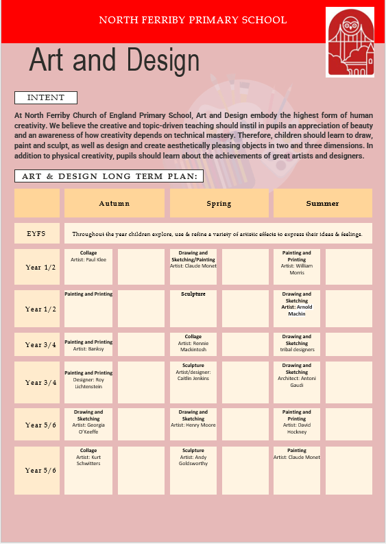 At North Ferriby Church of England Primary School, Art and Design embody the highest form of human creativity. We believe the creative and topic-driven teaching should instil in pupils an appreciation of beauty and an awareness of how creativity depends on technical mastery. Therefore, children should learn to draw, paint and sculpt, as well as design and create aesthetically pleasing objects in two and three dimensions. In addition to physical creativity, pupils should learn about the achievements of great artists and designers.
